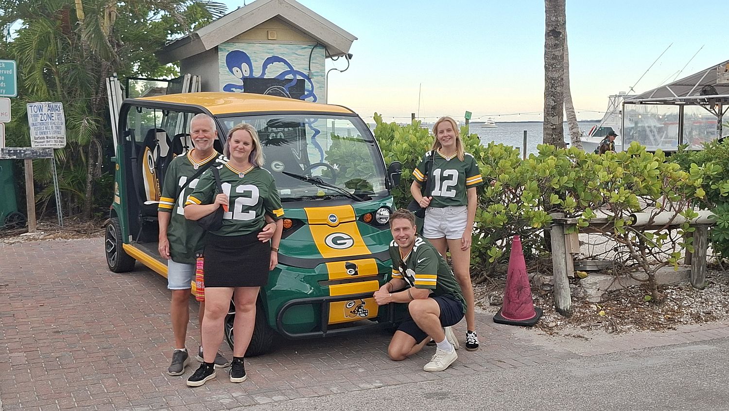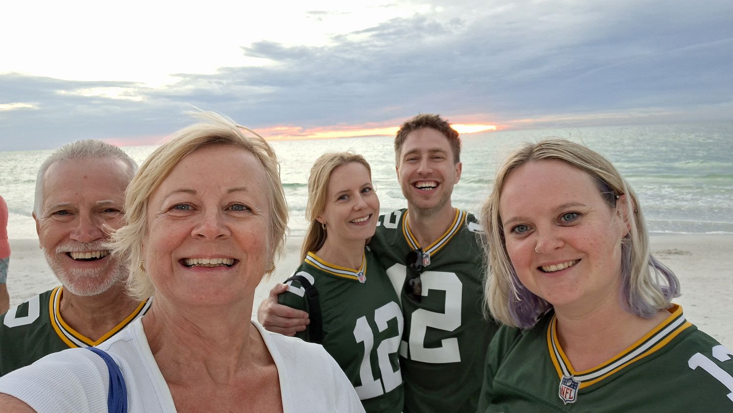 The match is a huge disappointment as they lose in the last minute, at home too. The only saving grace is they scored one touchdown so we got a jello shot. [Kev - one lousy jello shot? They give you a free shot every time the Packers score a touchdown. Last time we had 5.] Still, there's a great atmosphere. Whilst they watch I have a wander round shops and sit on the dock reading. Also do a spot of knitting. George wants some scuttler artwork and Ind buys her some driftwood art and she buys herself a manatee print and a top. The lovely waitress was a Chicago fan and afterwards changed from her Packer top and came out in her true colours.