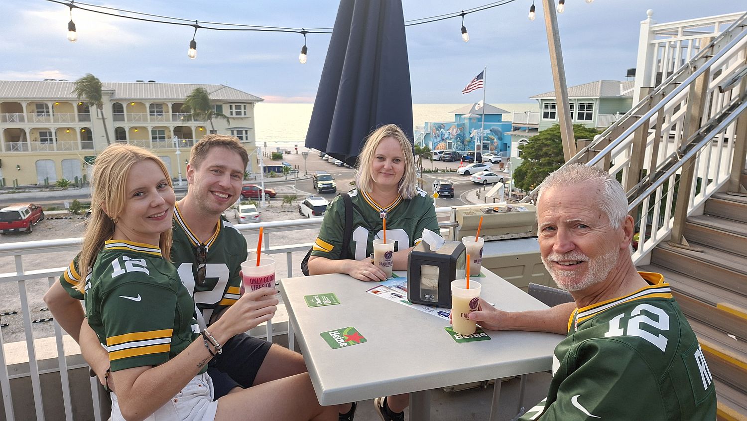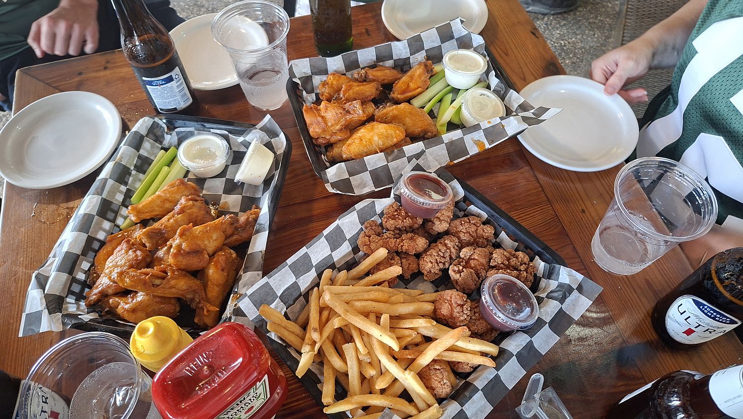 There are loads of Packers fans. We have beer, wings and tenders to start, but also have chowder and fried cheese during the course of the game, plus multiple beers a couple of cocktails (one of which was free as the waitress said she'd rung up the wrong order) and Ind had a bloody mary with a huge array of pickles as garnish.