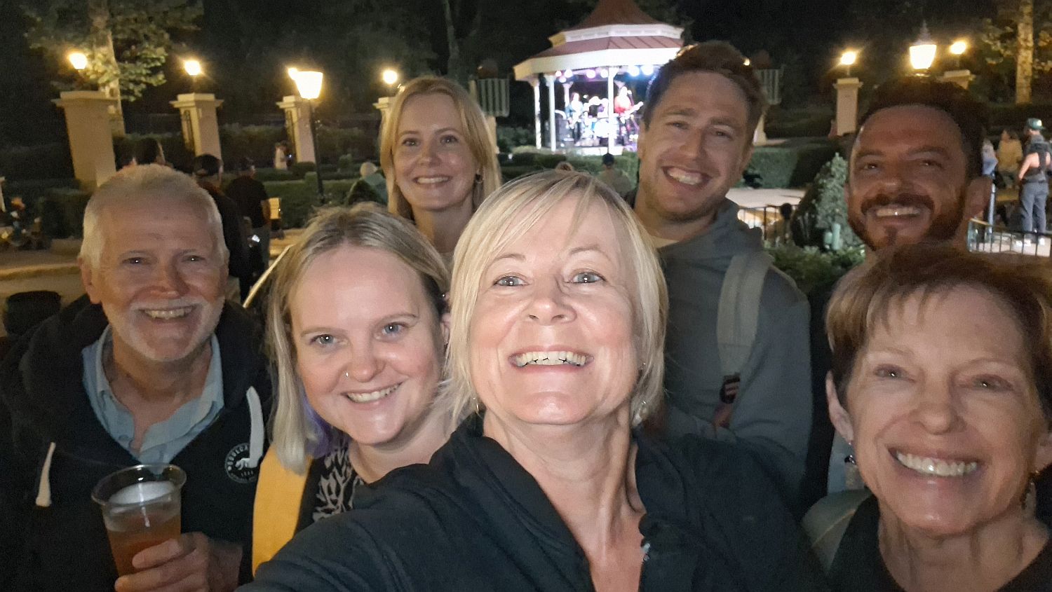 Walking round World Showcase towards Canada we stop at a booth for churro bites with apple, ice cream and caramel sauce. These things are a big hit and we have them a few more times during the holiday. Beers from Canada and we watch the band in the garden in the UK pavillion. They're very good.