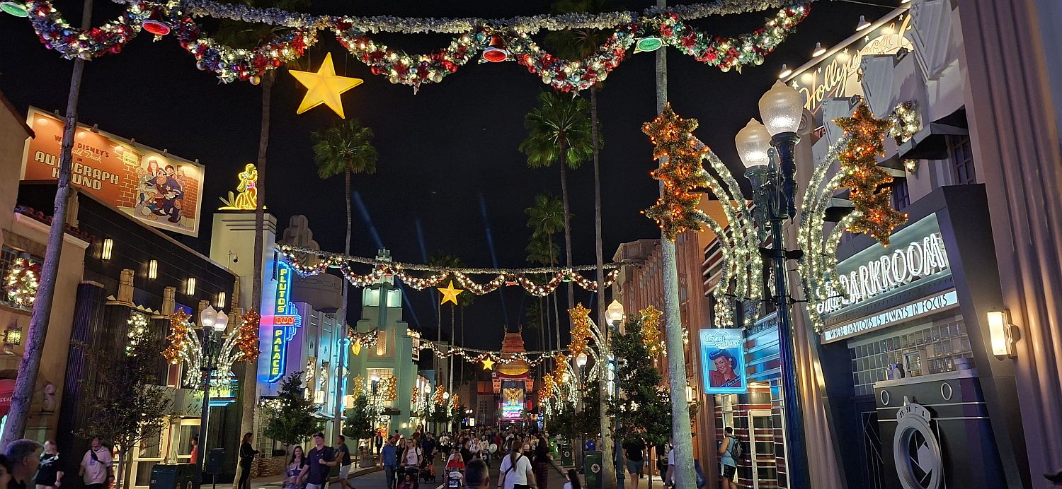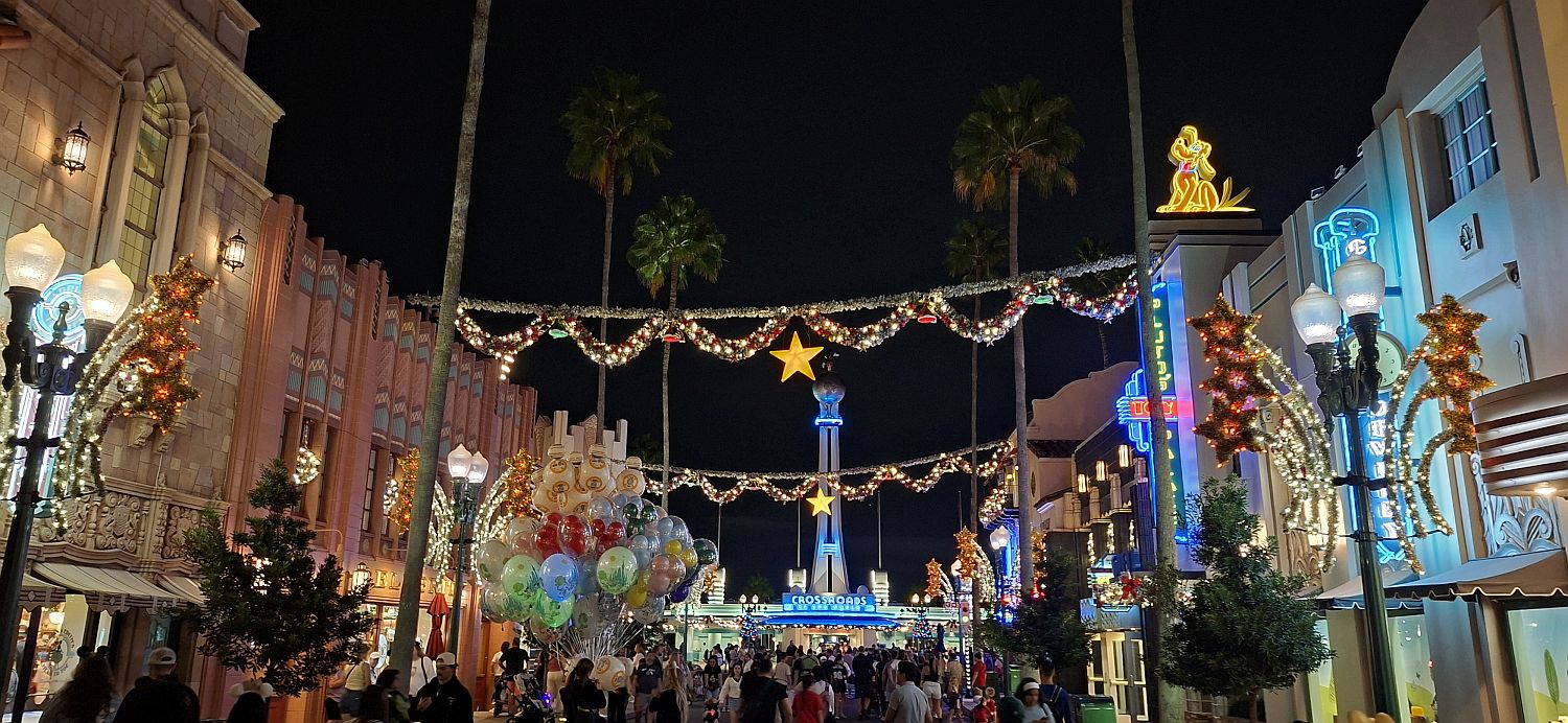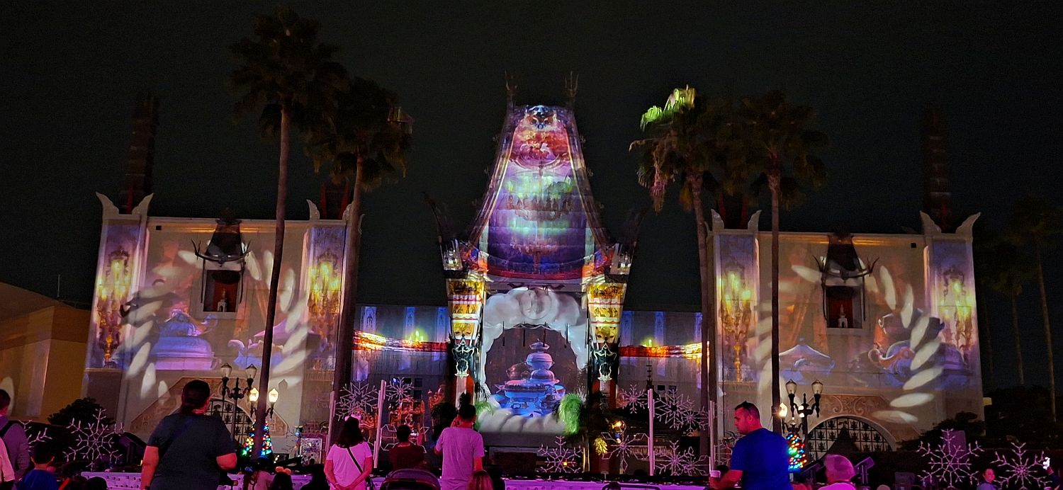We meet up and then immediately split up as Tam and I wander round in the dark looking at the Christmas decorations, the rest ride Rock 'n Roller Coaster. I grab a beer from a cart and Tam has another cold brew coffee thing and we all meet back up for the 2 projection shows in front of the theatre. They're nice enough, but not a must see.