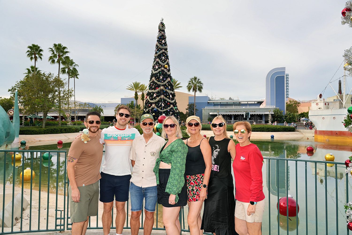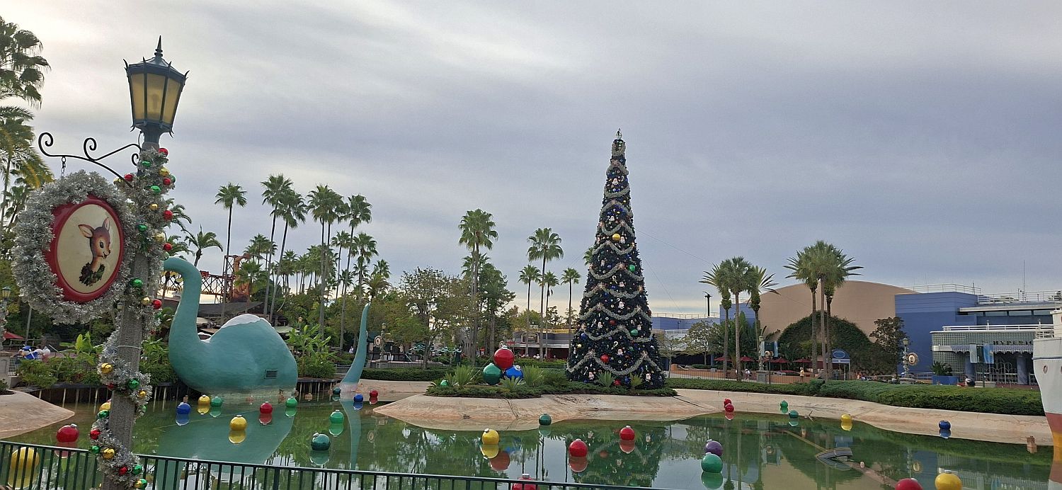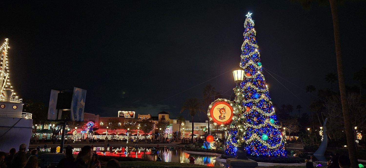 We meet up and then immediately split up as Tam and I wander round in the dark looking at the Christmas decorations, the rest ride Rock 'n Roller Coaster. I grab a beer from a cart and Tam has another cold brew coffee thing and we all meet back up for the 2 projection shows in front of the theatre. They're nice enough, but not a must see.