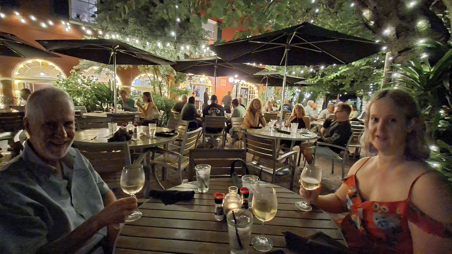 For supper we go to Harry's Seafood Bar and Grille as we'd already decided we fancied fish tonight. Google suggested this and we'd walked past yesterday and saw how pretty the patio area was. Well the walk to the restaurant was so quiet compared to Saturday night so we were somewhat shocked when we walked into the garden area and it's packed. It's a bonus as there's also a guitarist playing. We got a lovely table for 3 and enjoy some bread and garlic boursin type spread and then Kev and I have mahi mahi, mine is Mahi arugula with a light lemon beurre blanc , arugula salad and corn maque choux, all of which was delicious. Kev has the Mahi Mahi with lemon cream sauce, mash and broccoli. Ind has Cajun seared tuna, served rare, over creole rice with sesame soy greens and a sriracha aioli honey chilli glaze. We all thoroughly enjoy our meals and the cost was great compared to other restaurants we'd considered for fish. We have definitely noticed that things are so much more expensive on this trip than 3 years ago.