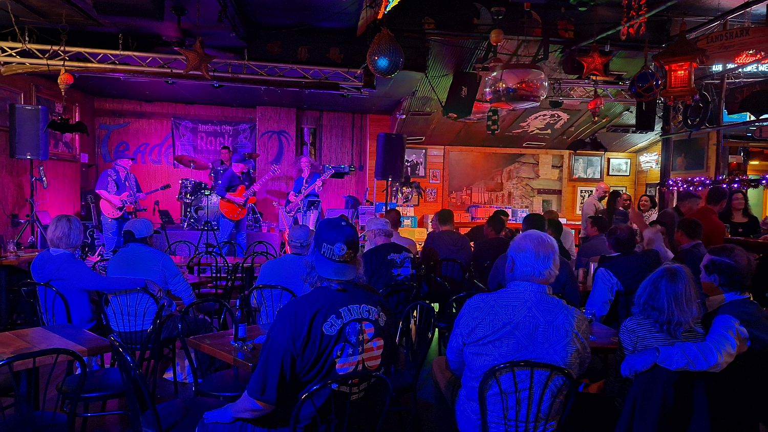 It's raining lightly when we leave and we try to get in at Anne O'Malley's where there's music but it's quite tiny and packed, so we go to Tradewinds again where there's a rock band fronted by a lady singer, singing all the classics.
