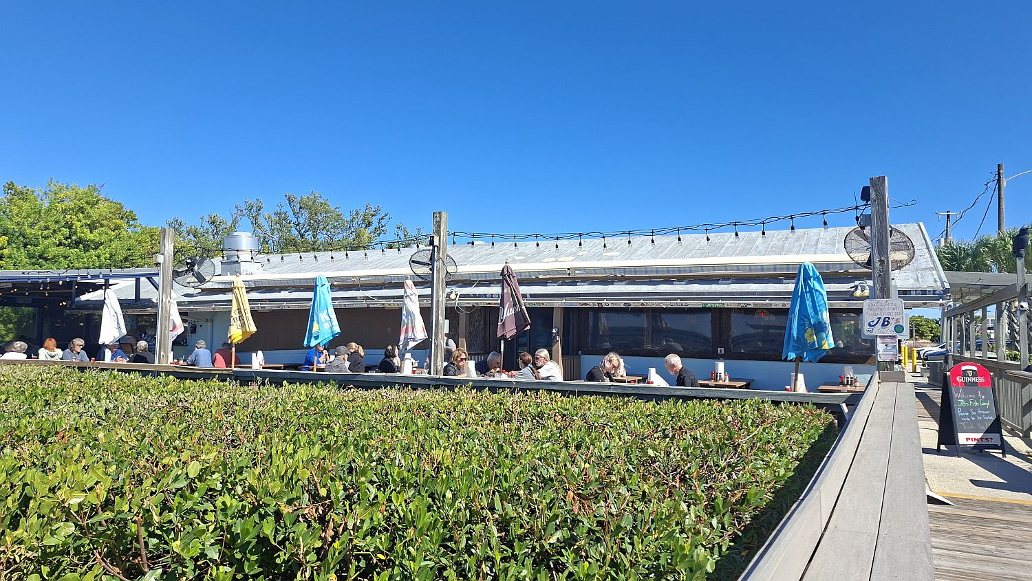 There is a half moon so you can see the beach and hear the waves and we all have jackets so it isn't too chilly. I only want something light so go for shrimp nachos, but they were a huge plateful, Kev, Ind and George have grouper tacos which they say are delicious and Charlie has a burger and wedges and starts with coconut shrimp which he'd remembered from last time. A lovely start to our AMI holiday, we then browse the lovely clothes in their shop before going just up the road to Bortell's lounge, a sports bar where we sit at the bar and have a beer, before heading back for bed. It's been a long day but great to be reunited.
