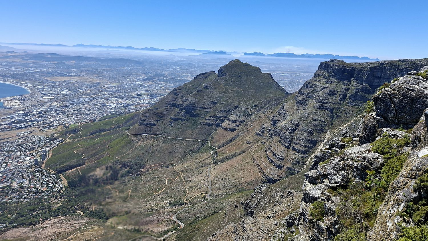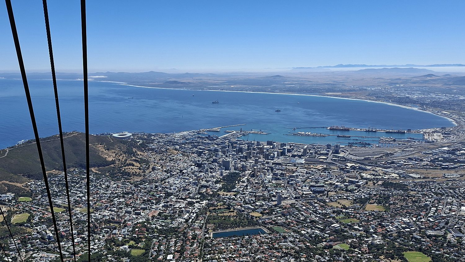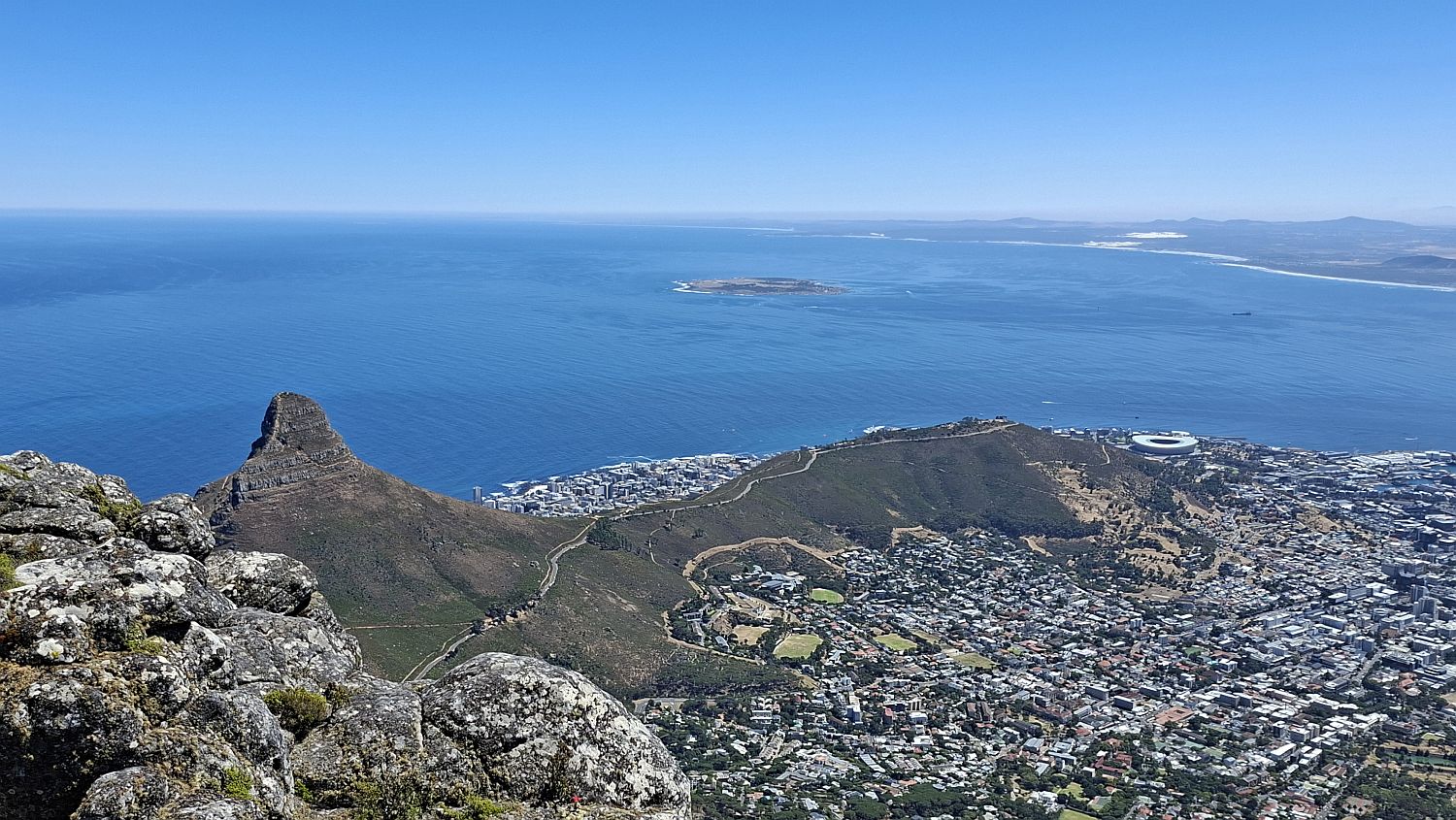 In this photo you can see the road that leads to Signal Hill. Also the stadium built for the 2010 World Cup. In the middle of the sea is Robben Island where Nelson Mandela was imprisoned for many years.