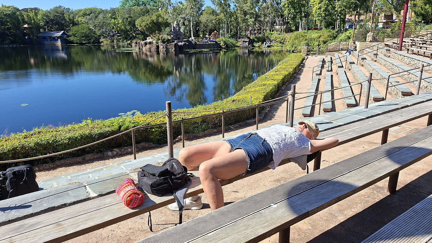 India wants to do Expedition Everest single rider, so Tam and I take a break in the outdoor theatre area that used to house the short lived nightime show. Tam takes this a bit too literally.