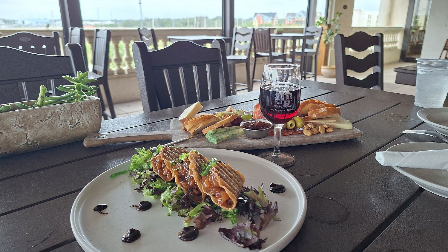 Back to the house as the plan, as it's cooler, today is to do San Sebastian winery and St Augustine distillery. At the winery we opt for the $5 tour. There's a short wait for the next one so we browse the cute gift shop while we wait. There's some lovely wine related items and also bottles of their own wine, port and cream sherry for sale. The cutest bottle is in the shape of the lighthouse and a donation of each sale goes towards it's upkeep. The tour starts and we're led upstairs to a small room with wooden pews where we watch a video about how the winery came to be and what happens from planting of vines to harvesting. Then we walk through a section where you can see the casks where the wine goes and the barrels it can be aged in. We're then taken back downstairs for the wine tasting. About 8 of us sit around a bar whilst the guide pours a sample of 5 wines and 1 port. Our favourite was probably the port. We all agreed that the tasting seemed very rushed, we hardly had time to sniff the wine let alone savour it before the next sample was ready to be poured into the same glass. We'd read that there is an excellent restaurant on the 3rd floor of the winery. We go up and decide to sit outside on the covered veranda. It's quite chilly so we move from the table near the edge into a more sheltered spot. You can still see the inlet though as it's just round the corner from where we had breakfast the first morning. We all have a beer and order a glass of port to share to go with the cheese from the charcuterie board we ordered and we also have salmon tartar tacos. The food is very tasty.