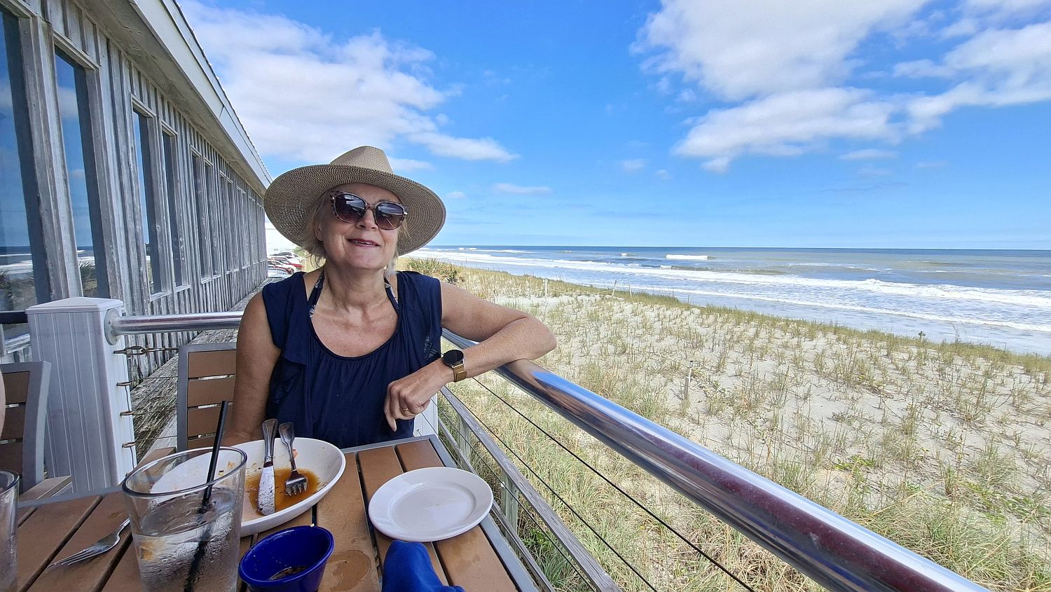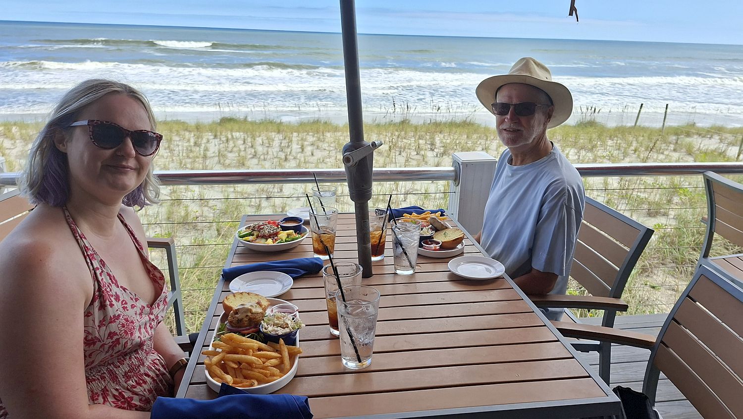 Enjoy a read and spot of knitting before we get in the car to the Reef restaurant which overlooks the beach. Sit on the balcony and have a delicious lunch. Kev has mahi sandwich with chips and salad, Ind has crab sandwich with chips and salad and I have Asian tuna salad which is delicious. As we're watching the waves Ind spots a dolphin, from then on we see quite a few. A real joy - eating great food in a beautiful spot and seeing dolphins.