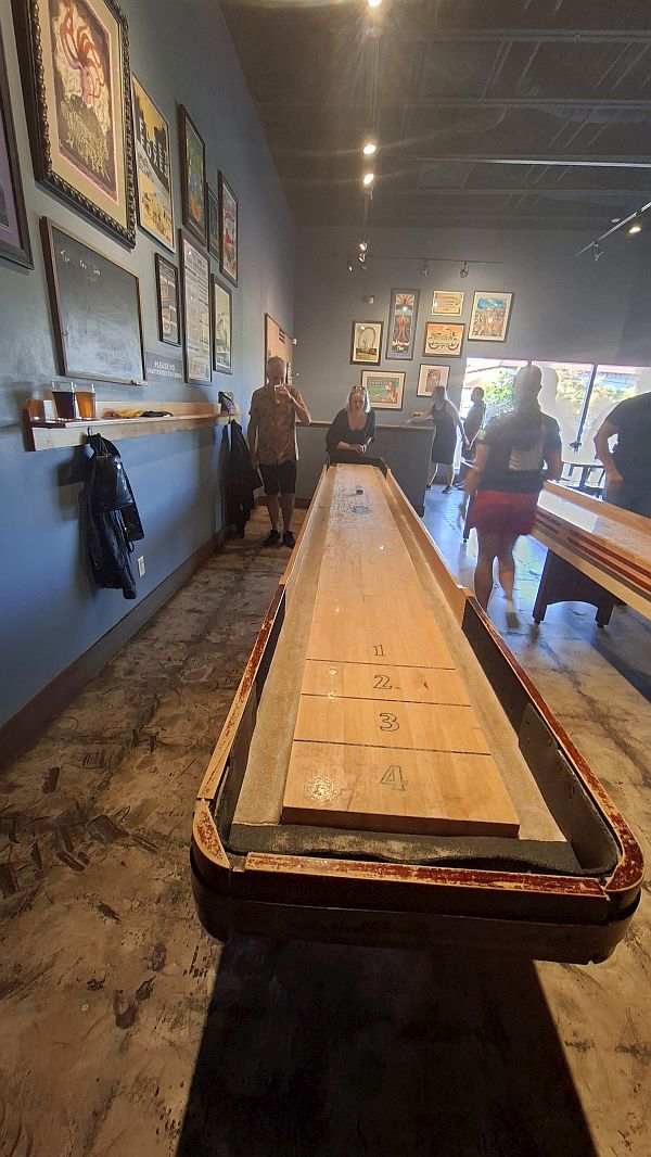 Home and spend more downtime by the pool before getting ready for our last evening here. We go to The Dog Rose Brewery, a microbrewery and bar. We all have beers then play on the shuffle board table, Kev is the victor.