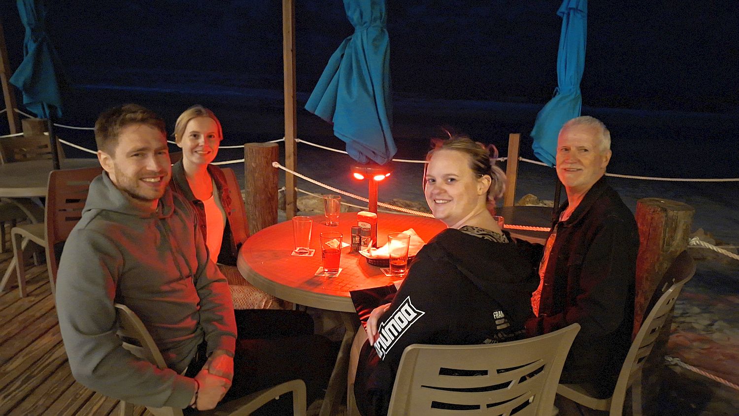 There is a half moon so you can see the beach and hear the waves and we all have jackets so it isn't too chilly. I only want something light so go for shrimp nachos, but they were a huge plateful, Kev, Ind and George have grouper tacos which they say are delicious and Charlie has a burger and wedges and starts with coconut shrimp which he'd remembered from last time. A lovely start to our AMI holiday, we then browse the lovely clothes in their shop before going just up the road to Bortell's lounge, a sports bar where we sit at the bar and have a beer, before heading back for bed. It's been a long day but great to be reunited.