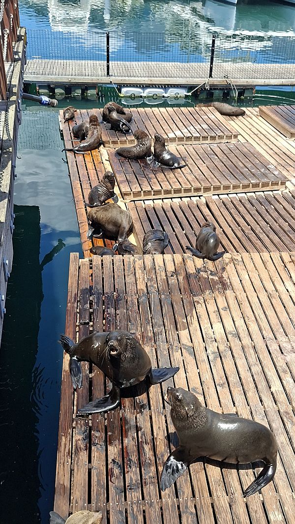 Just as we decide to head back to the bus stop we see a hop on approach so we go back up to the top deck. We drive through Bantry Bay on to Sea Point, but we decide not to get off here and just enjoy the scenery and the commentary. We get off at the aquarium stop and decide to take advantage of the free 30 minute boat tour that's included with our 2 day ticket- either a Harbour or Canal Cruise. We go to the watefront and the next cruise to depart is the harbour cruise. We don't have long to wait so get on board and have front row seats. Again the commentary is very interesting about how the Victoria and Alfred Waterfront came in to being and how it was re-developed in the 90's to make part of it into the shopping, dining centre it is today. However it is still used by the fishing industry to pack and freeze fish that gets served at all of Cape Town's restaurants. The Green peace Rainbow Warrior is in the harbour too. We also see loads of seals swimming around, sitting in the tyres on the harbour walls and also on a safe platform. They're very cute but boy do they smell really bad.