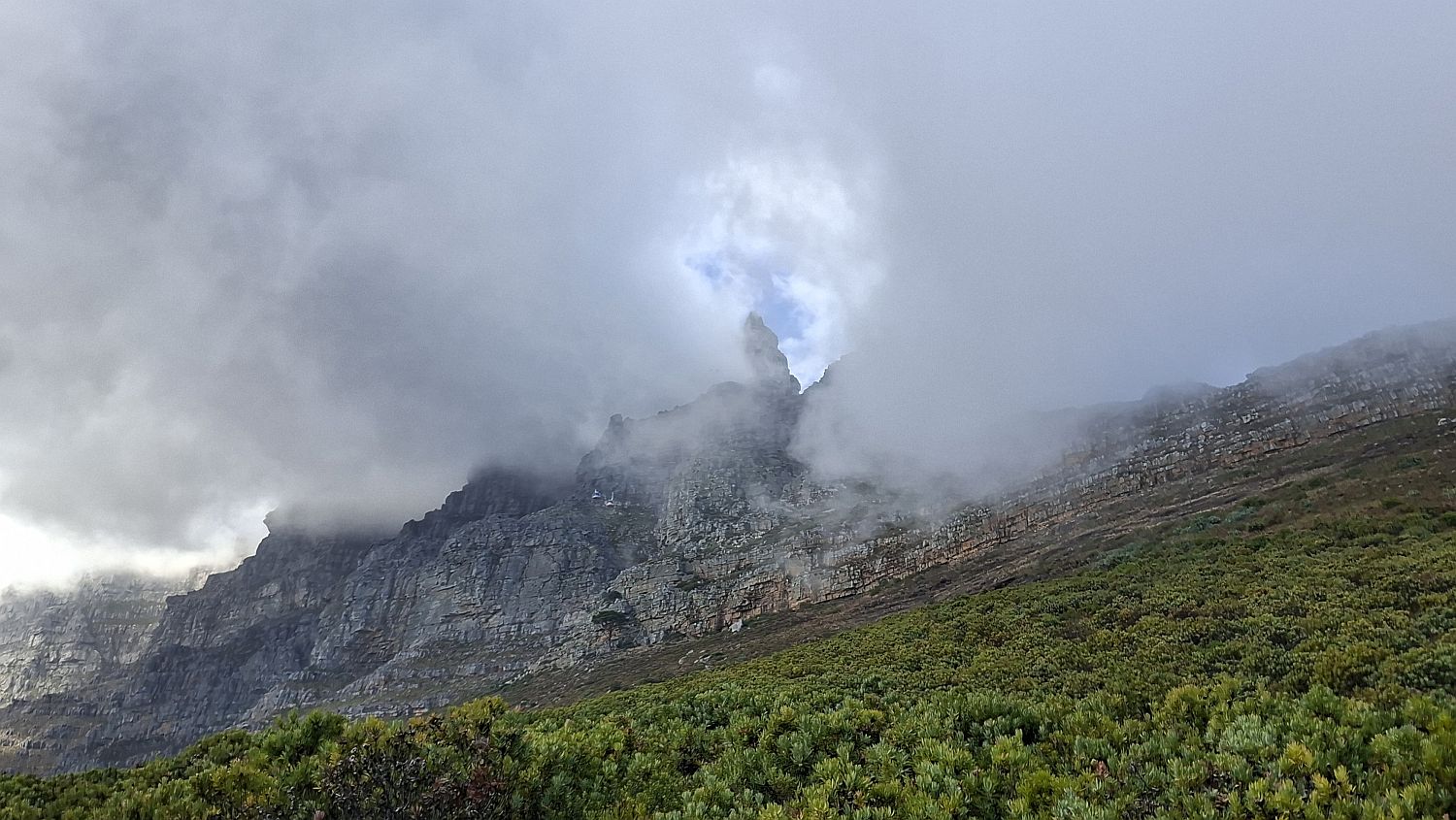 We head on up to Table Mountain and this morning the clouds are rolling in at the top and it's decidedly chilly, it definitely wouldn't be the best day to go up in the cable car to see the views. We were lucky we got such great views when we did it earlier this week. We decide to get off in Camps Bay which is stunning - the white beach has huge rocks in places but it's got a massive amount of sea mist over it so we can hardly see the rocks but we can hear the waves crashing, decidedly spooky. We take some photos of the stunning scenery and watch paragliders coming down from Signal hill and landing nearby.